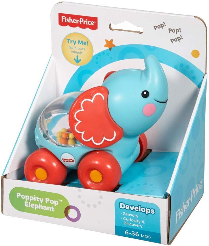 Вълнуващи събития, забавни звуци и блестящи отблясъци насърчават детето да пълзи и да бута слончето отново и отново. Слон Fisher-Price® Poppity Pop™ е с перфектен размер за хващане и държане с малки ръчички.