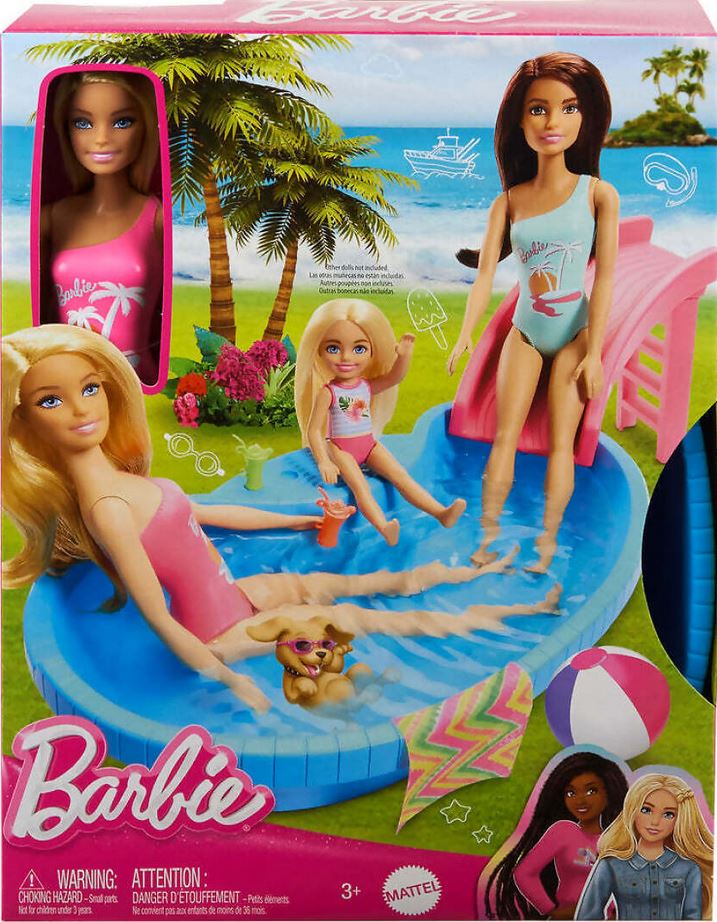 Включва 1 кукла Барби, 1 басейн, 1 пързалка с стълба, 1 кърпа и 2 аксесоара за напитки.