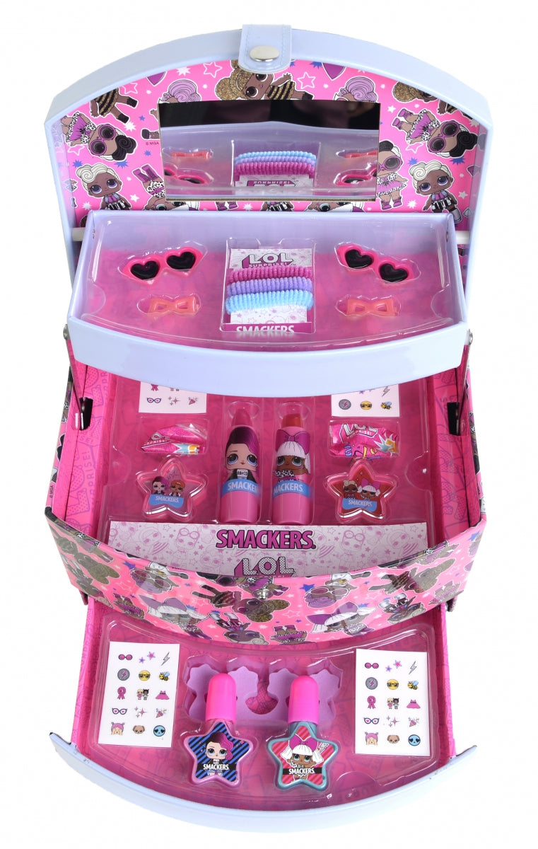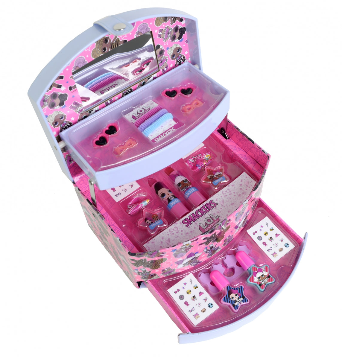 Открийте вълшебния свят на грима и бижутата с невероятния LOL Surprise Makeup Case for Jewelry 1482229E! Този козметичен комплект съчетава лукса на грима с бляскавия стил на LOL Surprise, предлага игрово изживяване, което стимулира креативността и въображението. Практичната кутия за грим има три слоя, които осигуряват организирано пространство за козметични аксесоари. Отворете кутията и открийте различни аксесоари за коса, фиби, лакове за нокти, стикери за нокти, разделител за пръсти, блясък за устни, червило и две малки изненади. С огледалото на капака кутията се превръща във вашия личен козметичен кът. Гламурната колекция включва 2 блестящи блясъка за устни (2.4г), 2 червила (5г), 2 лака за нокти (13.4мл), 2 фиби, 2 ластика за коса, 2 пръстена, 3 ластика за коса, разделител за пръсти и модна чантичка с дръжка и закопчаване, за да бъдат аксесоарите ви сигурни и организирани. Позволете на децата да открият света на красотата с този колекционерски комплект LOL Surprise – специален подарък, който ще стимулира тяхното въображение и ще ги насърчи да изразят своя личен стил.
