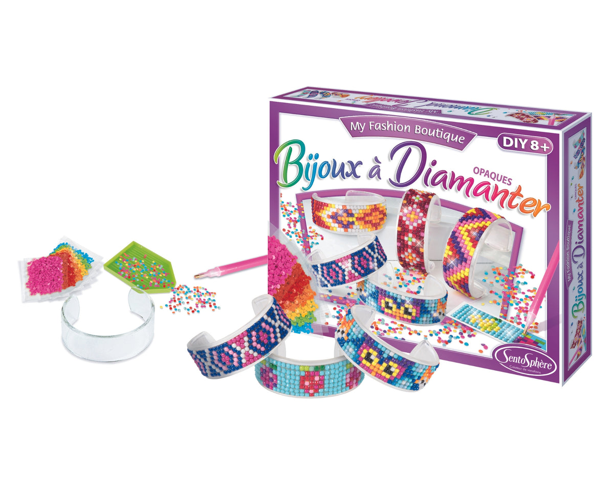Създайте 6 гривни с геометрични и цветни мотиви! Лесни за изработка и носене, те са също така перфектни за подаръци. Всяко квадратче непрозрачен диамант се взема с помощта на лепилна писалка и се поставя върху лепкаво платно според моделите. Когато приключите, нанесете малко лак отгоре, за да закрепите всичко на място, и прикрепете вашето прекрасно творение към един от 6-те включени акрилни поставки. Отлична дейност за млади модни ентусиасти и майки!