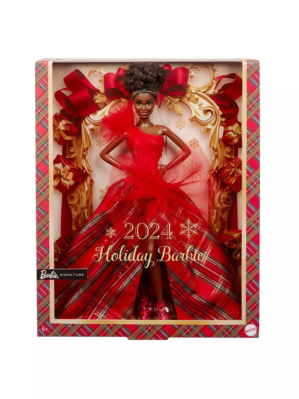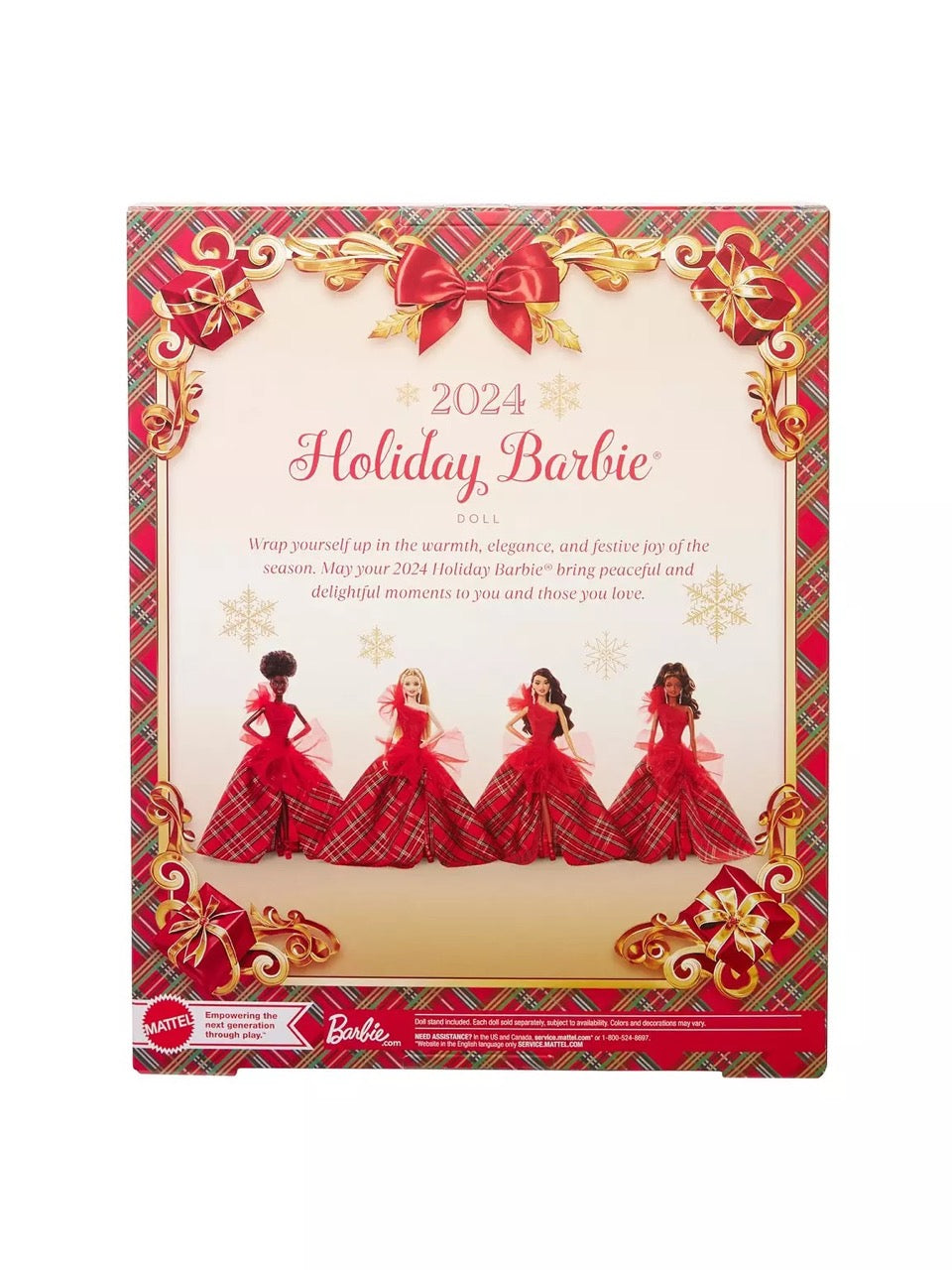 2024 Holiday Barbie куклата излъчва топлината и любовта на празничния сезон с празнична рокля и празничен вид! Роклята предлага прекрасна драма, тъй като се съчетават падащ червен бодик с едно рамо и пълна карирана пола в стил балетна рокля. Големите тюлени детайли са модерен поглед към класическия вид.