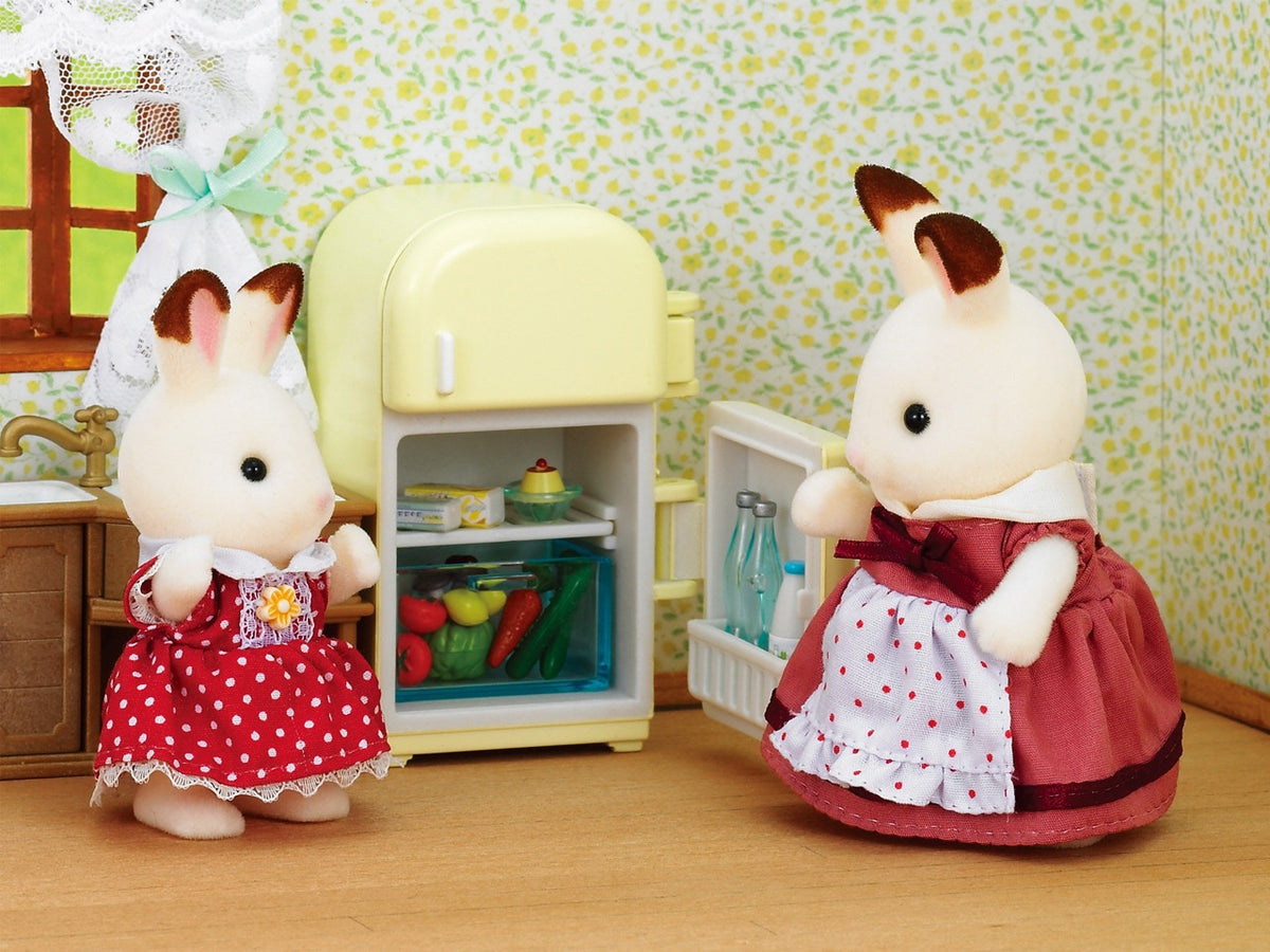 Освен хладилника и различните аксесоари в този комплект, ще намерите и Тери Шоколад, облечена в красива червена сутрешна рокля и престилка. Включва ежедневни необходими продукти като мляко и масло, както и здравословни закуски под формата на плодове и зеленчуци, както и някои сладки лакомства. Този комплект с майката на шоколадовото зайче е отличен начин да напълните коремчетата на вашите жители на Силвания!