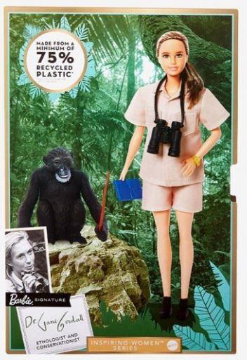 Серията Barbie Inspiring Women отдава почит на невероятните героини на своето време: смели жени, които са поемали рискове, променяли правилата и проправяли път на поколения момичета да мечтаят още по-големи мечти. В чест на десетилетията отдаденост, пробивни изследвания и героични постижения като природозащитничка, експерт по поведението на животните и активистка, Barbie посвещава специална колекционерска кукла на д-р Джейн Гудол, DBE, основателка на Института Джейн Гудол и Посланик на мира на Обединените нации. Куклата е изработена от рециклирана пластмаса. Заедно с маймуната Дейвид Грейбърд, куклата Barbie д-р Джейн Гудол носи полево облекло и е оборудвана с бинокъл и тефтер.
