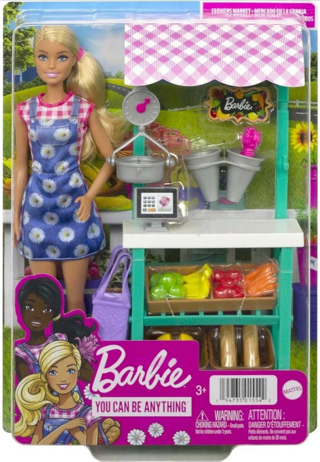 Открийте света на пазаруването с играчния комплект Barbie® Farmers Market. Куклата Barbie® (русокоса/29 см) носи сладка рокля на каре с флорална престилка, както и дълги розови ботуши, и е готова да помага на клиентите. Пазарът има покрив с каре и рафтове с две кошници, съдържащи плодове, зеленчуци, сирене и хляб. Има и съд за цветя, където може да продава свежи цветя. Куклата Barbie® може да претегля зеленчуците на везна с реално движеща се стрелка, да ги опакова за клиентите и да регистрира покупката на касата. Комплектът включва пазарски щанд, плодове, зеленчуци, сирене, хляб, цветя, пазарска чанта и каса.