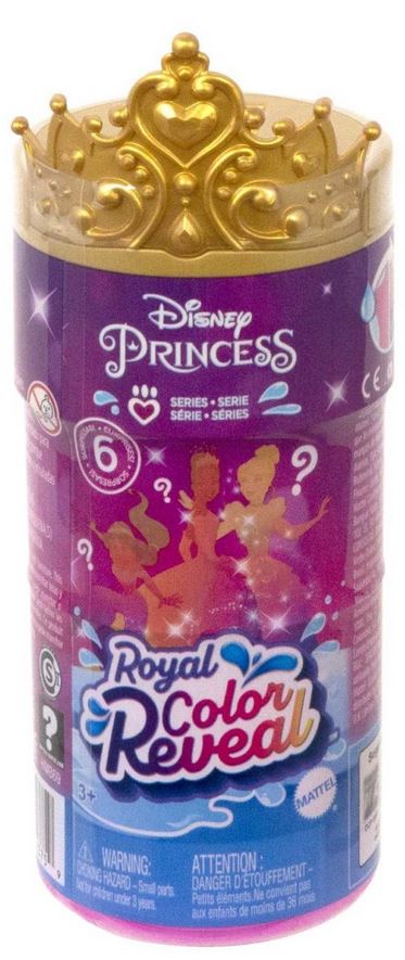 Вълнуващо изживяване при отваряне на опаковката идва с тази колекция от малки кукли Disney Princess! Феновете ще бъдат възхитени от куклите Royal Color Reveal™ - но коя принцеса ще получат? Всяка кукла е тайна, докато не добавите вода, което активира технологията Color Reveal™. За още повече забавление при отваряне на опаковката са включени пет допълнителни изненади: симпатично приятелче и още 4 аксесоара, включително мека пола за куклата и пръстен за детето!