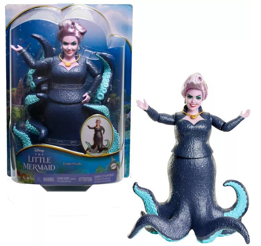 Запознайте се с могъщата злодейка от Дисни "Малката русалка"! Куклата Урсула е подвижна и представена с характерните си пипала с блестящи детайли и има своя лилава прическа за забавно стилизиране. Феновете могат да събират всички кукли от "Малката русалка" и да създават свои приключения над или под вълните! Всяка кукла се продава отделно, в зависимост от наличността. Цветовете и украсите могат да варират.