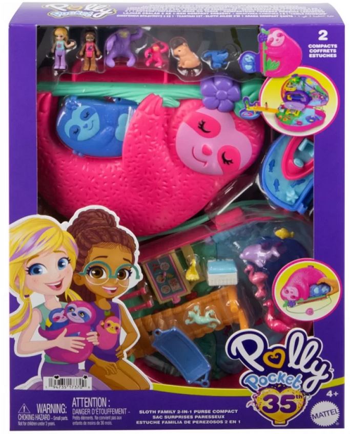 Забавлявайте се с Polly Pocket™ в този сладък Sloth Family 2-в-1 компактен портфейл! Външната част на портфейла е оформена като мама ленивец с бебе ленивец, прикрепено към корема ѝ! И мама ленивецът, и бебето се отварят, разкривайки тропически джунглов тематичен комплект за игра с 2 микро кукли и 12 аксесоара (включително 8 домашни любимци)! Двата компакта се свързват с мостче за перфектно 2-в-1 игрово изживяване. Пътувайте по въжена линия с тукан приятел в компакта на мама ленивец или отворете палатката на ленивеца, за да откриете удобна люлка. Насладете се на водния басейн и се завъртете под водопада! След това преминете по мостчето към компакта на бебето ленивец и намерете тайния плаж за събиране на банани или се отправете на разходка с лодка! Когато е време за тръгване, свържете двата компакта и използвайте презрамката на портфейла, за да играете навсякъде и по всяко време! Отличен подарък за деца от 4 години нагоре, особено за тези, които обичат животните!