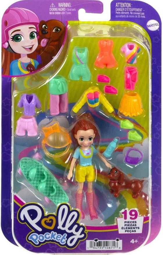 Mattel Polly Pocket - Кукла със спортен комплект за каране на скейтборд с домашен любимец (HKV90)