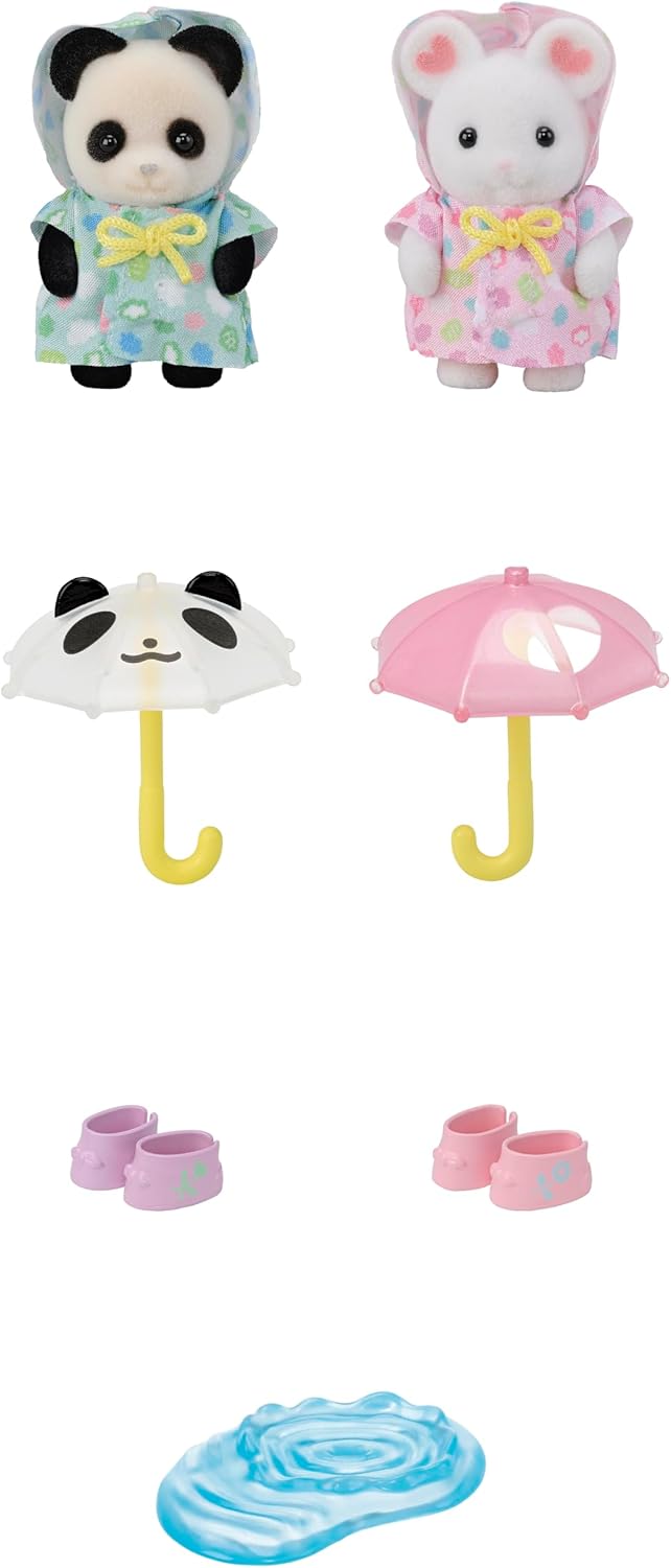 - Комплектът включва сладки чадъри, гумени ботушки и дори локва – идеално за игра в дъждовен ден. Чадърите пасват на ръцете на бебетата.