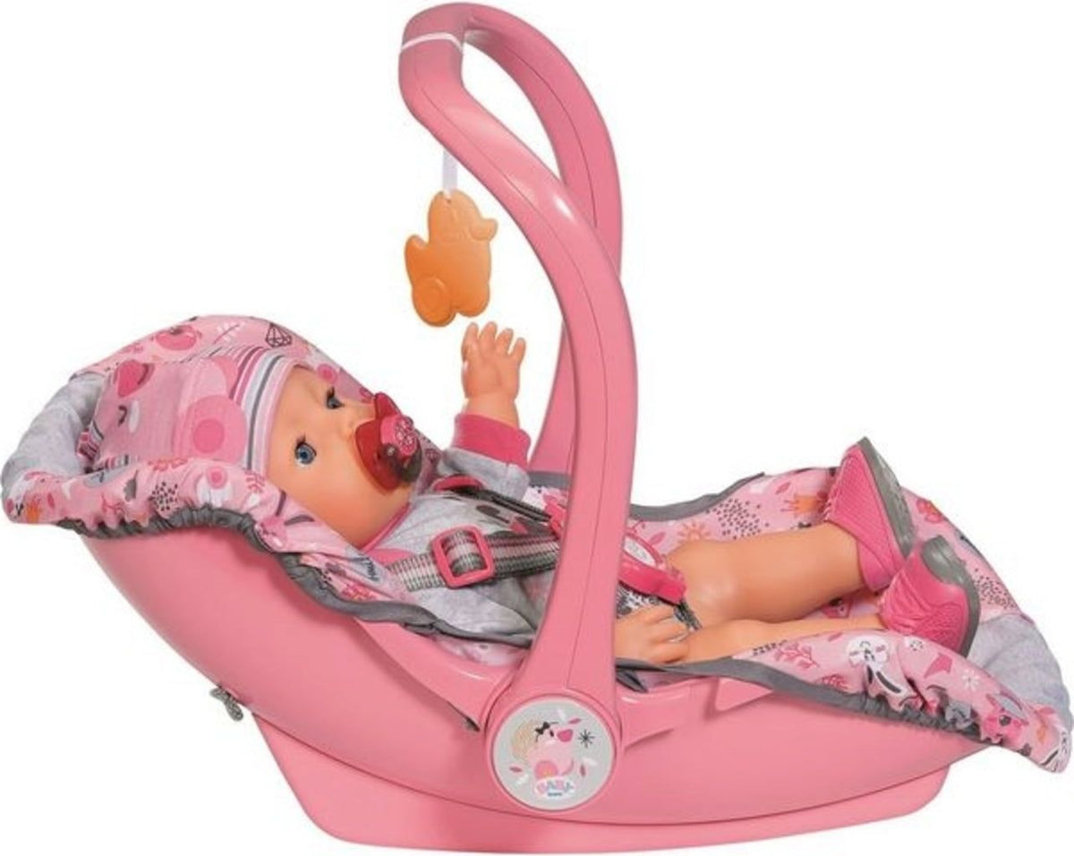 В удобното и внимателно проектирано обезопасително столче BABY born, седенето ще се превърне в нейното ново любимо занимание. Просто превключете дръжката на детското столче и вече имате перфектното седалка. Така малката изследователка може удобно да наблюдава околността. Коланът я държи сигурно в столчето, докато тя се обръща наляво и надясно и посочва всичко около себе си. Понякога няма нищо за гледане, тогава малката може да се отпусне и да заспи по гръб или да си играе с висящата играчка Патето Берта. Докато BABY born се наслаждава на удобното лежане, мама и татко могат без усилие да носят това леко столче. Ако BABY born се отегчи, столчето може да се използва и като люлка. Люлеенето успокоява и носи радост, както и игривият покривен материал.
